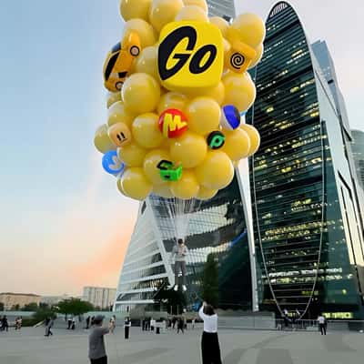 Yandex Go Man Lifted by Yellow Balloons Stunt